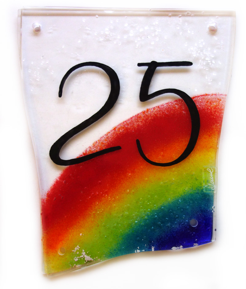 Die Hausnummer ist zweilagig und hat eine Glasstärke von ca. 8mm. Es sind 4 Bohrungen a' 6mm zur Befestigung vorhanden.