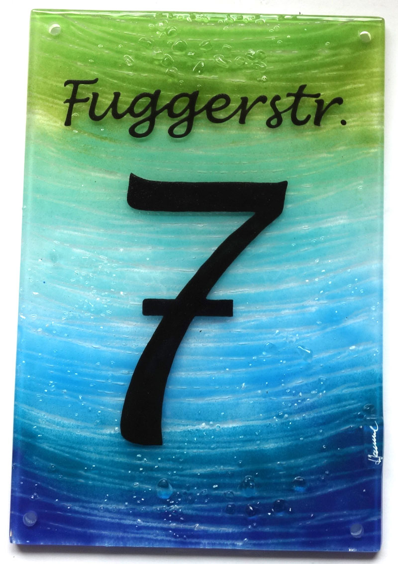 Die Hausnummer ist zweilagig und hat eine Glasstärke von ca. 8mm. Es sind 4 Bohrungen a' 6mm zur Befestigung vorhanden.