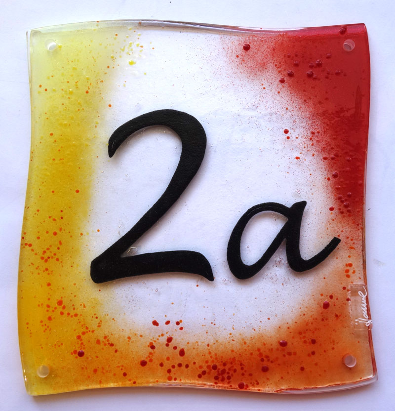 Die Hausnummer ist zweilagig und hat eine Glasstärke von ca. 8mm. Es sind 4 Bohrungen a' 6mm zur Befestigung vorhanden.