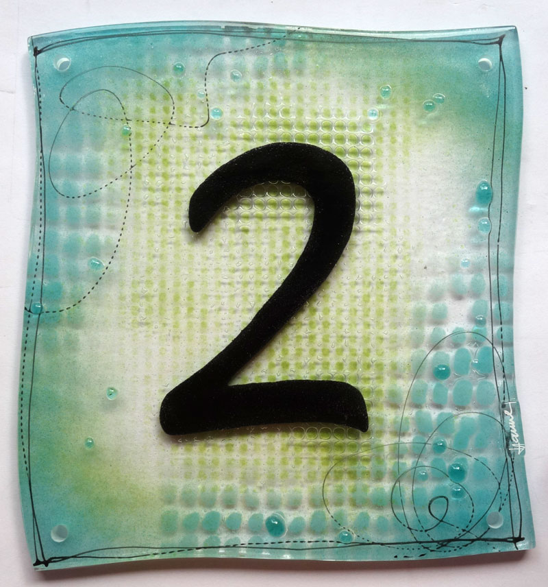 Die Hausnummer ist zweilagig und hat eine Glasstärke von ca. 8mm. Es sind 4 Bohrungen a' 6mm zur Befestigung vorhanden.