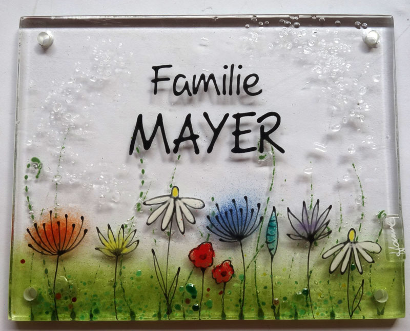 Das Namenschild ist zweilagig und hat eine Glasstärke von ca. 8mm. Es sind 4 Bohrungen a' 6mm zur Befestigung vorhanden.