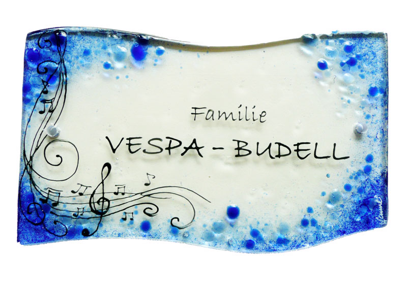 Das Namenschild ist zweilagig und hat eine Glasstärke von ca. 8mm. Es sind zwei Bohrungen á 6 mm zur Befestigung vorhanden.