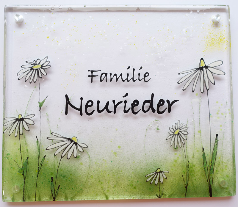 Das Namenschild ist zweilagig und hat eine Glasstärke von ca. 8mm. Es sind vier Bohrungen á 6 mm zur Befestigung vorhanden.