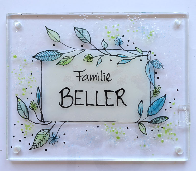 Das Namenschild ist zweilagig und hat eine Glasstärke von ca. 8mm. Es sind vier Bohrungen á 6 mm zur Befestigung vorhanden.