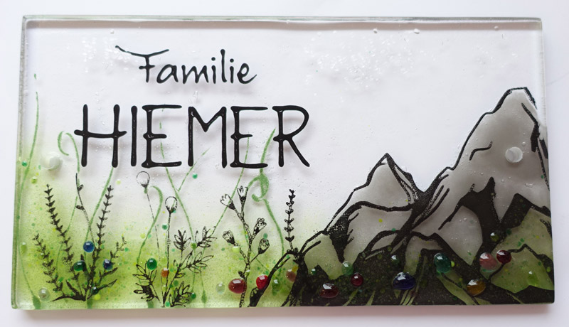 Das Namenschild ist zweilagig und hat eine Glasstärke von ca. 8mm. Es sind zwei Bohrungen á 6 mm zur Befestigung vorhanden.