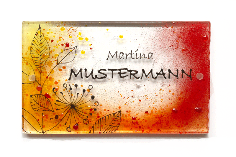 Das Namenschild ist zweilagig und hat eine Glasstärke von ca. 8mm. Es sind zwei Bohrungen á 6 mm zur Befestigung vorhanden.