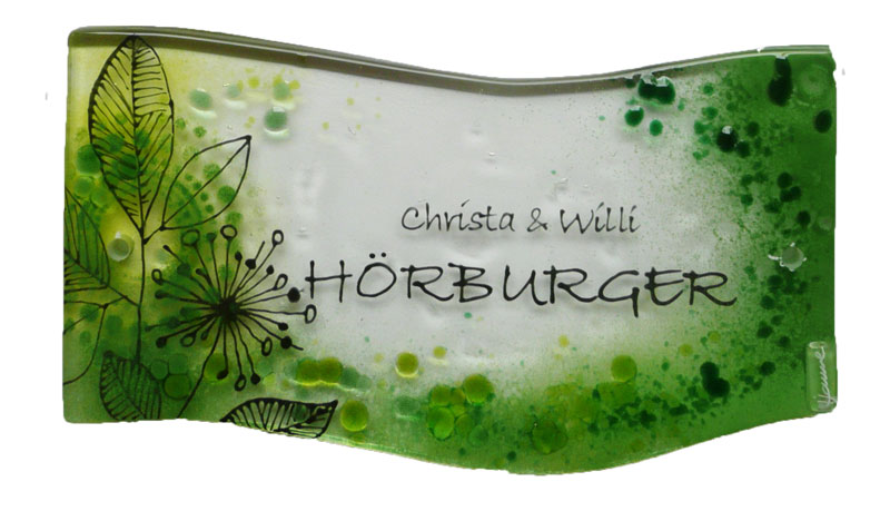 Das Namenschild ist zweilagig und hat eine Glasstärke von ca. 8mm. Es sind zwei Bohrungen á 6 mm zur Befestigung vorhanden.