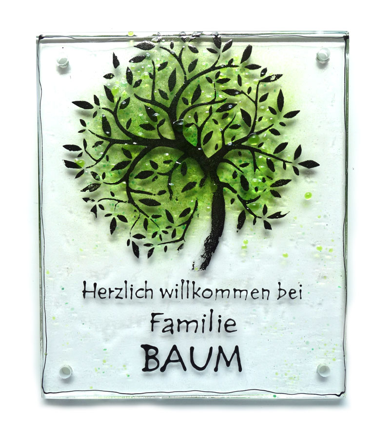 Das Namenschild ist zweilagig und hat eine Glasstärke von ca. 8mm. Es sind vier Bohrungen á 6 mm zur Befestigung vorhanden.