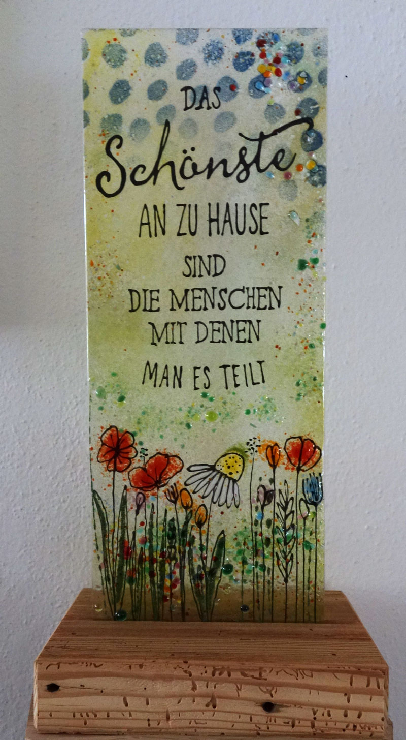 Glastafel in Altholz geklebt.