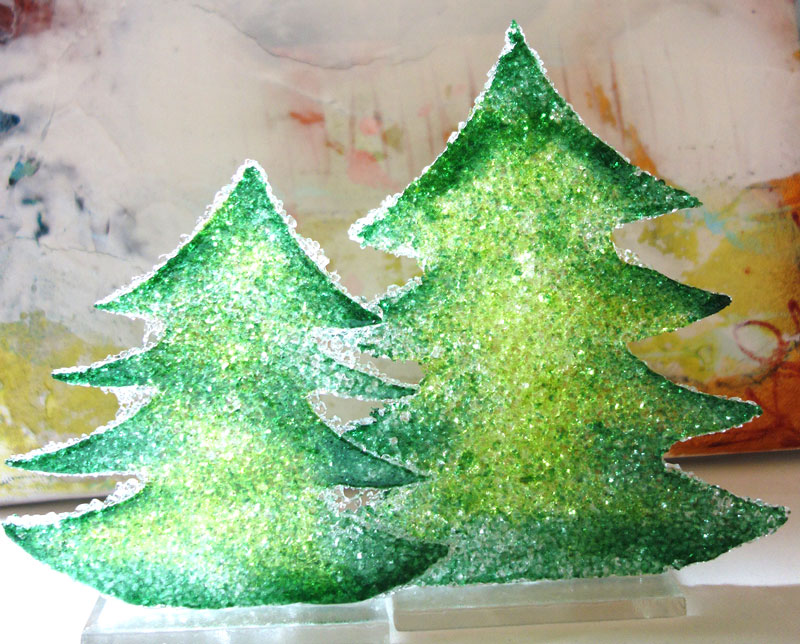 KröselTannenbaum klein mit Teelicht, 16x14cm auf Glasplatte geklebt 10x9cm,
